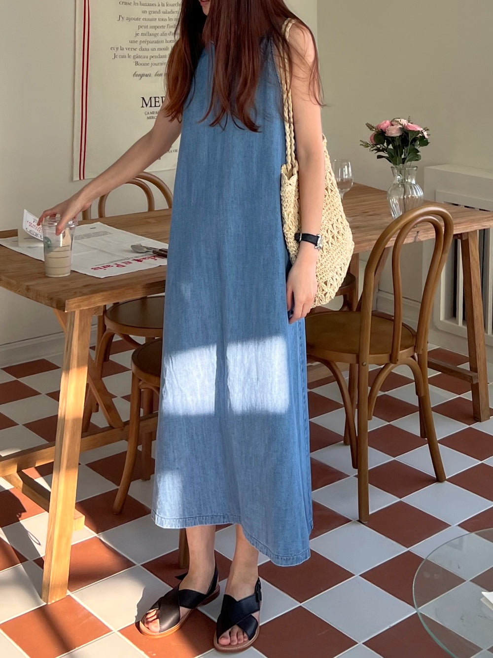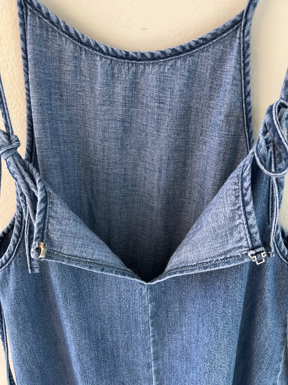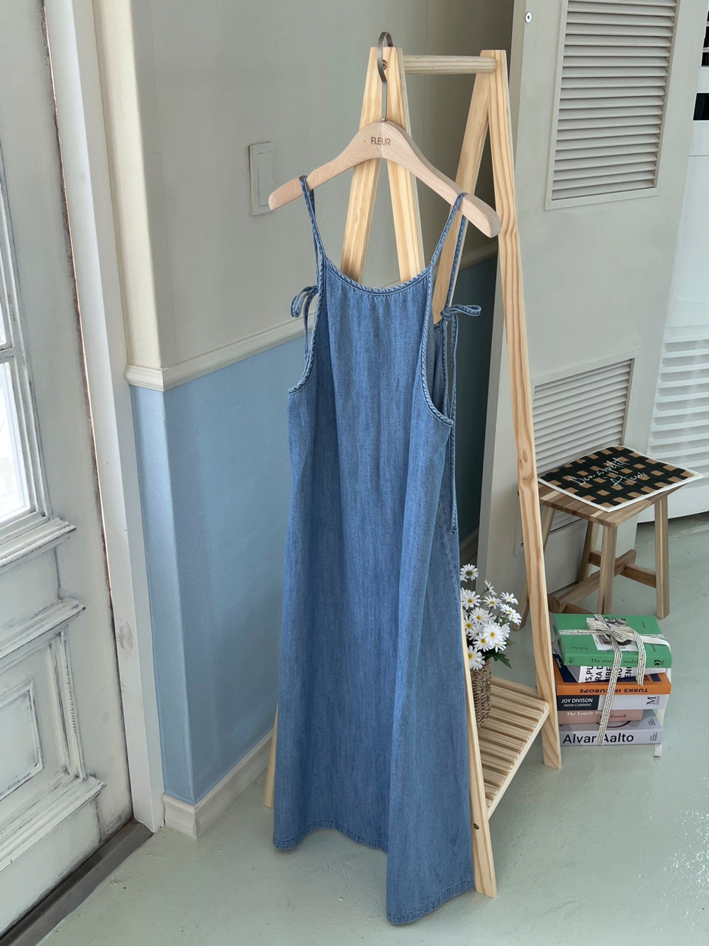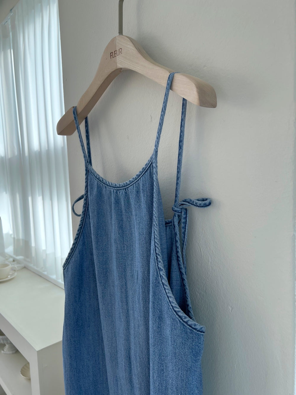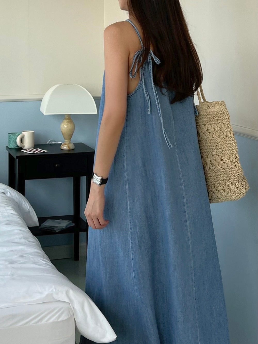 This Denim Maxi Dress is perfect for any occasion. Featuring fluid denim, shoulder ties, strap side pockets, and a slight a-line cut, this dress is comfortable and stylish. Effortlessly transition from day to night in this fashionable and functional piece.