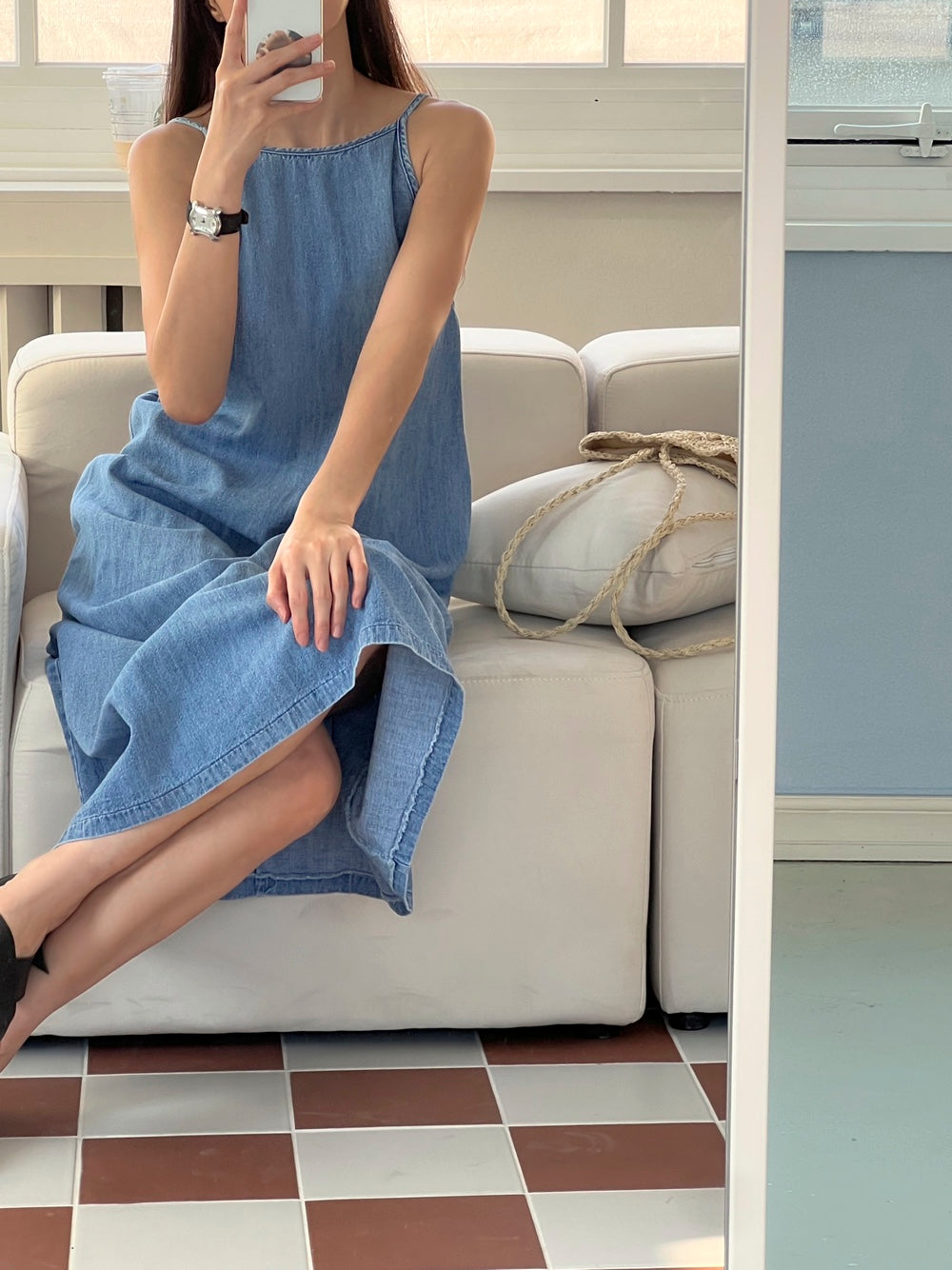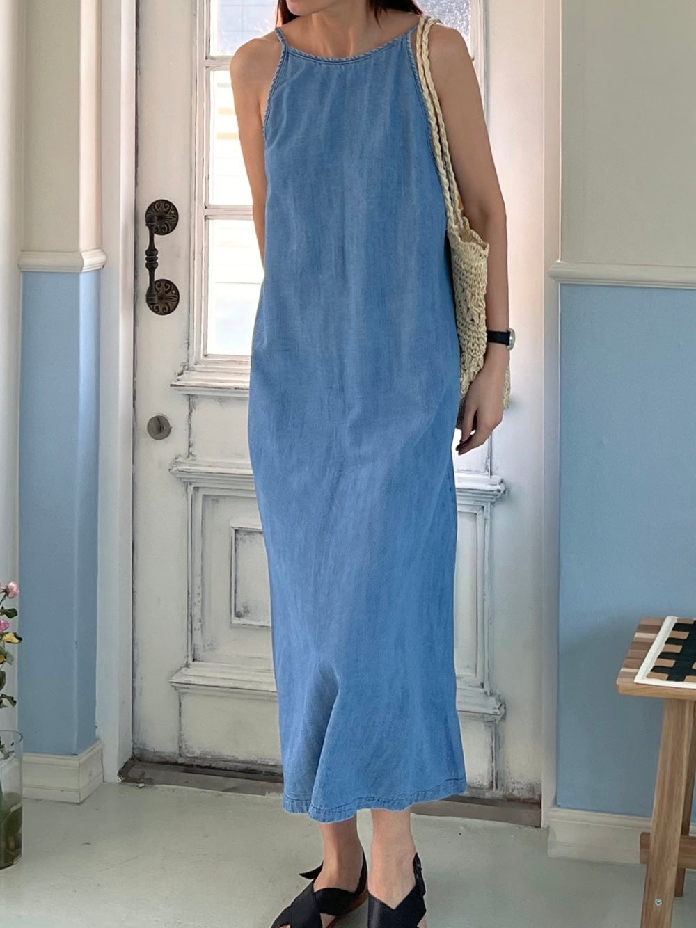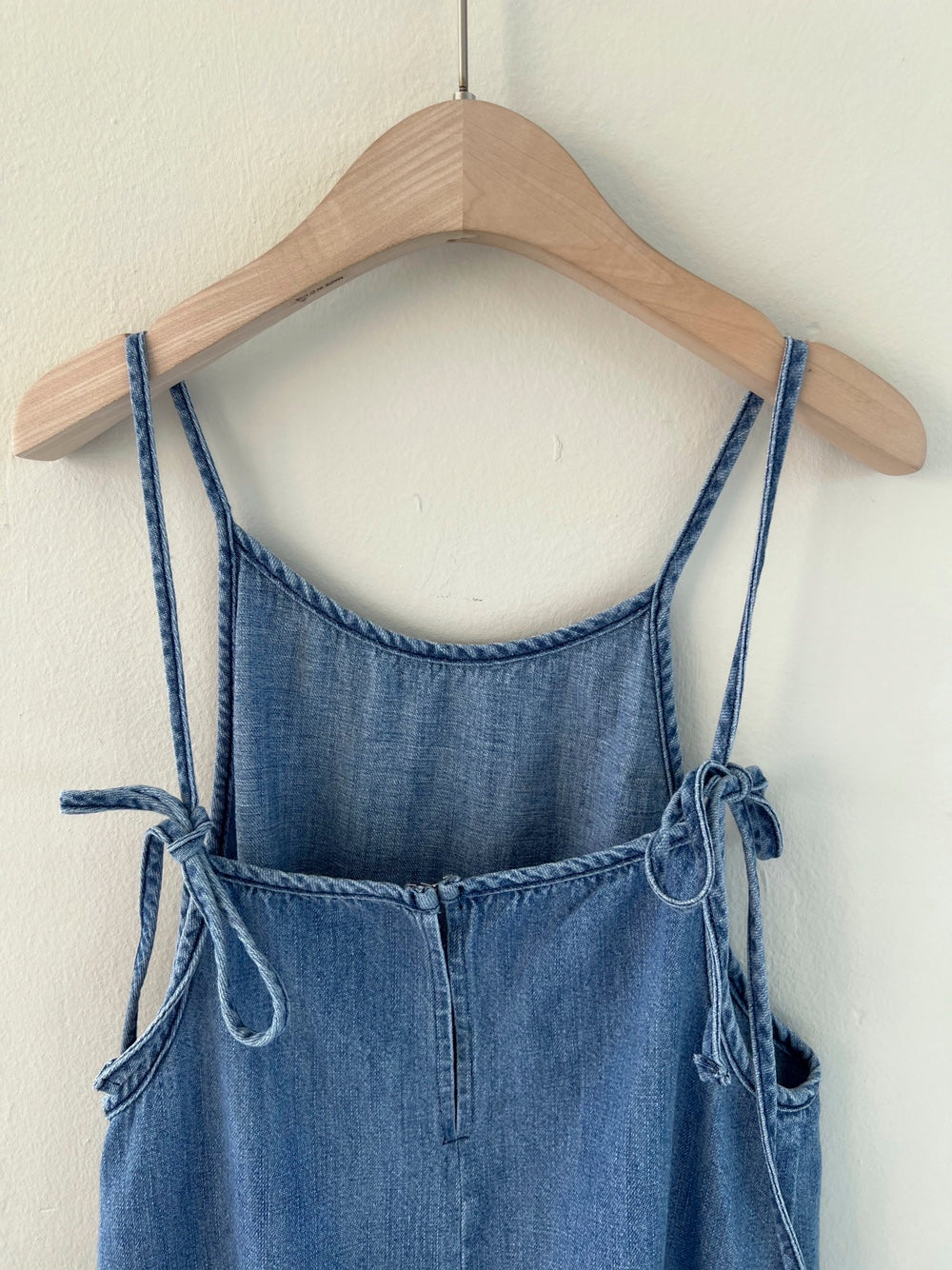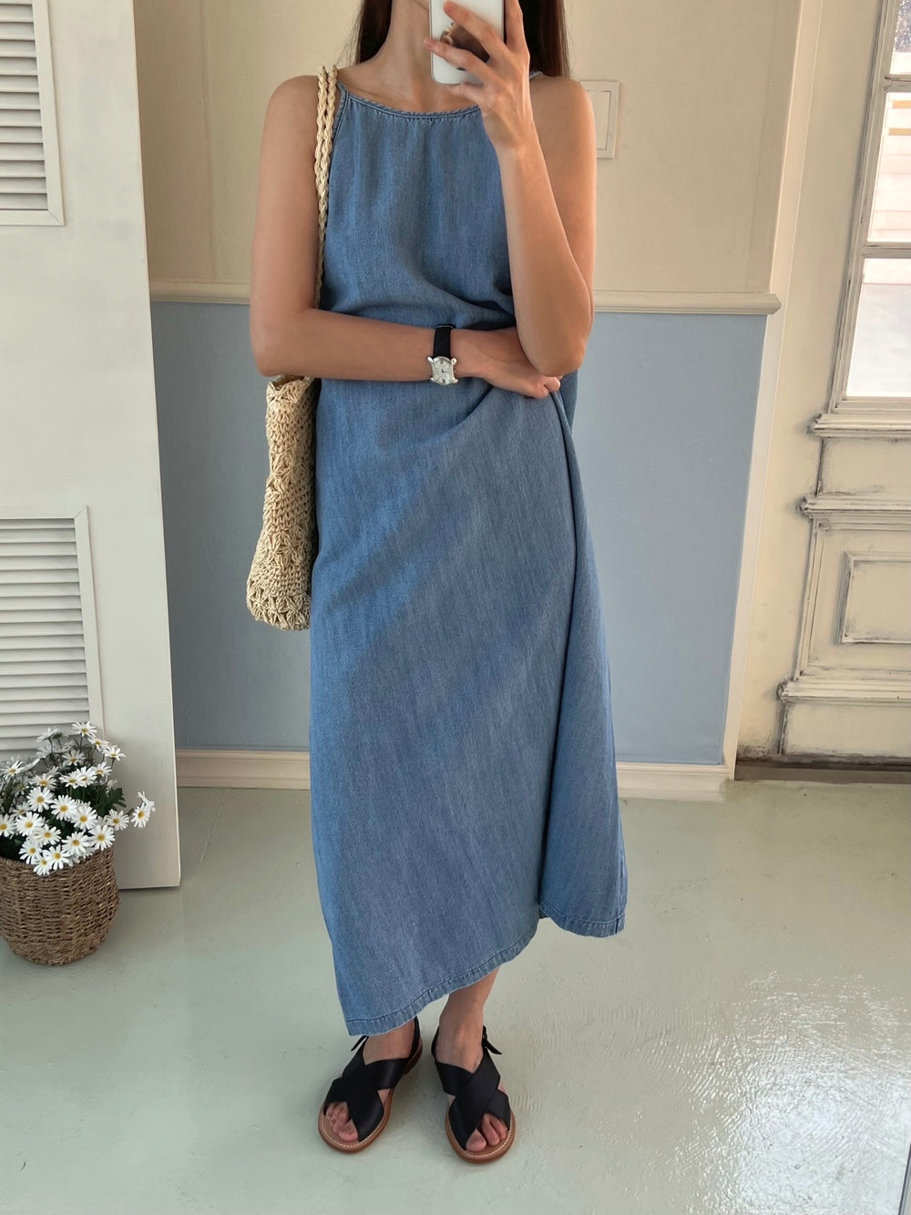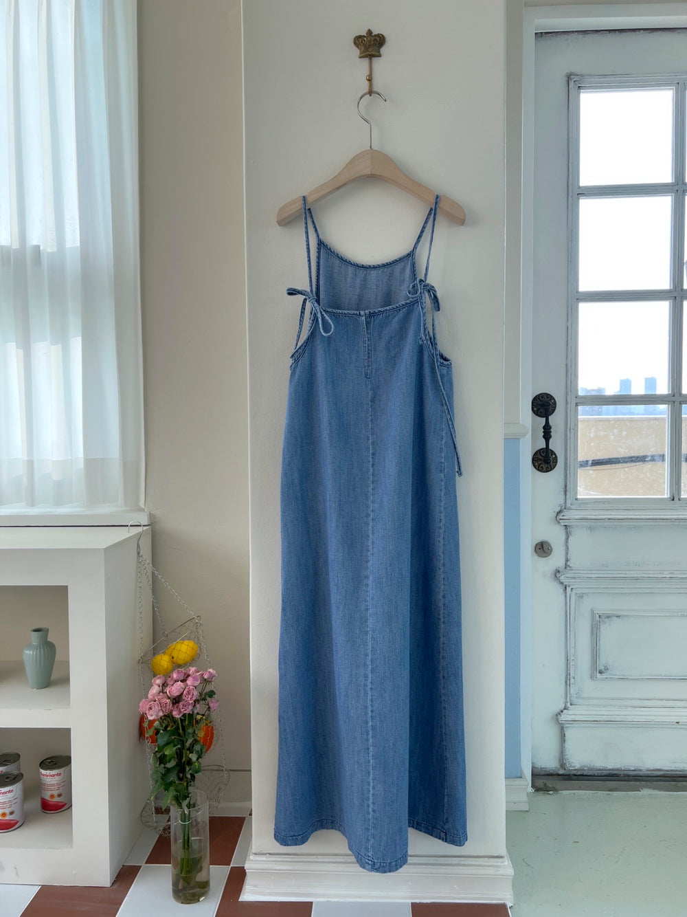This Denim Maxi Dress is perfect for any occasion. Featuring fluid denim, shoulder ties, strap side pockets, and a slight a-line cut, this dress is comfortable and stylish. Effortlessly transition from day to night in this fashionable and functional piece.