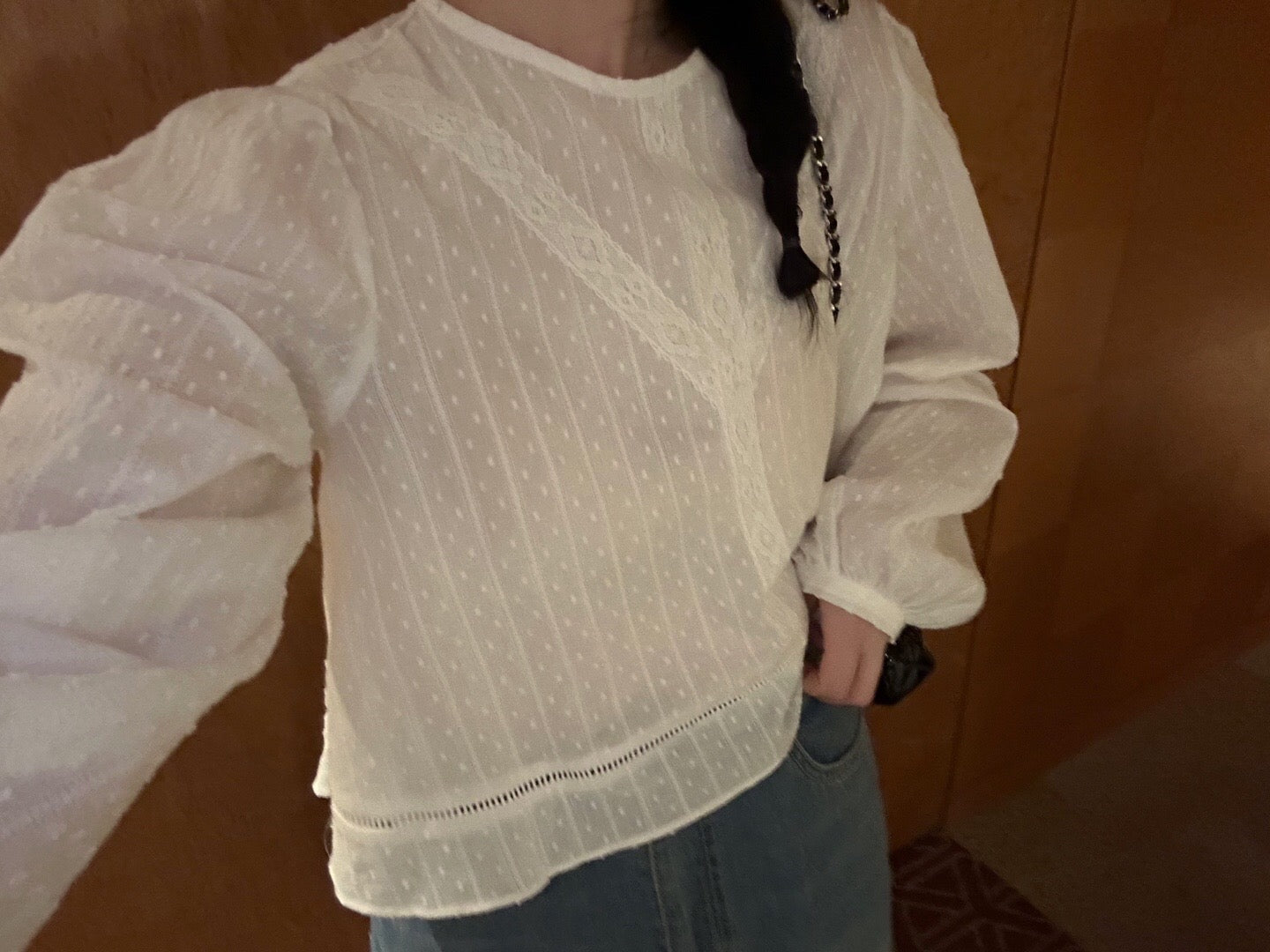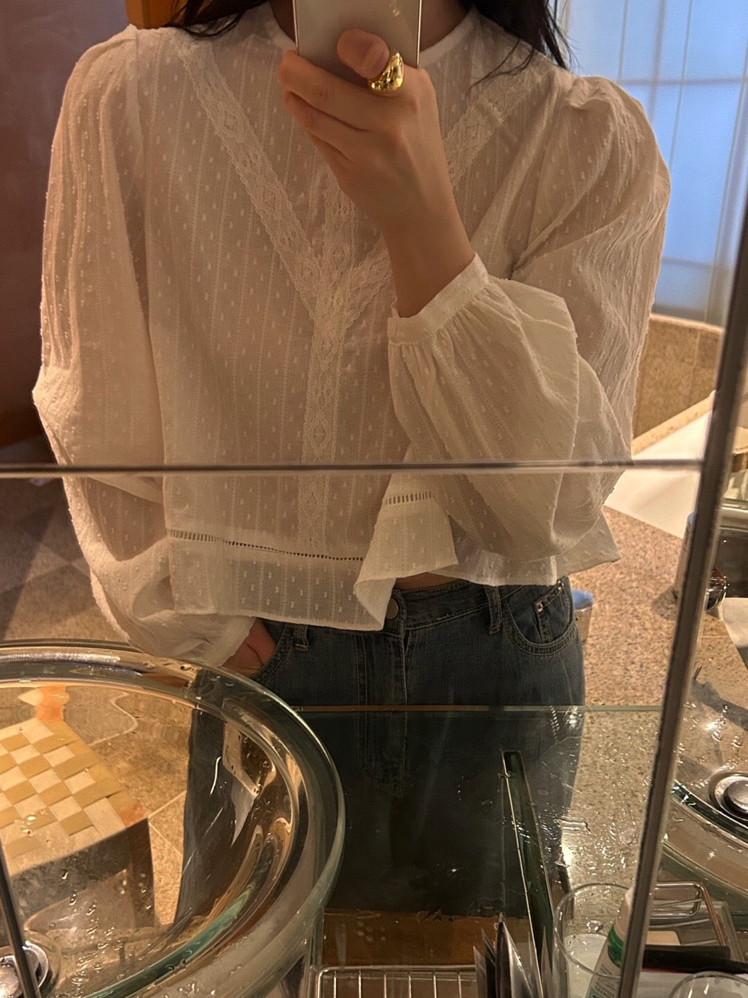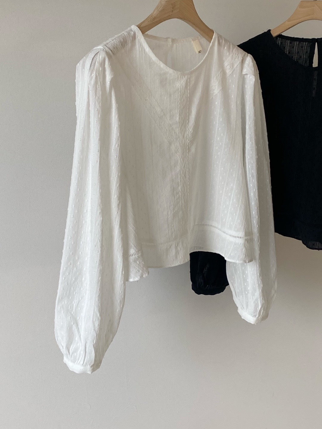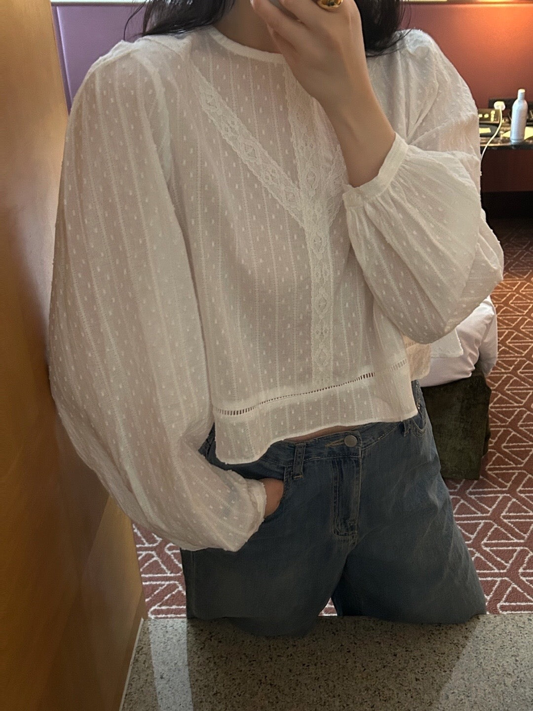 This cotton dobby blouse is both feminine and fun with its delicate lace trim. Versatile and perfect for any occasion, it is a great addition to your wardrobe for styling through all seasons. The cropped length and demure volume sleeves add an extra touch of style.