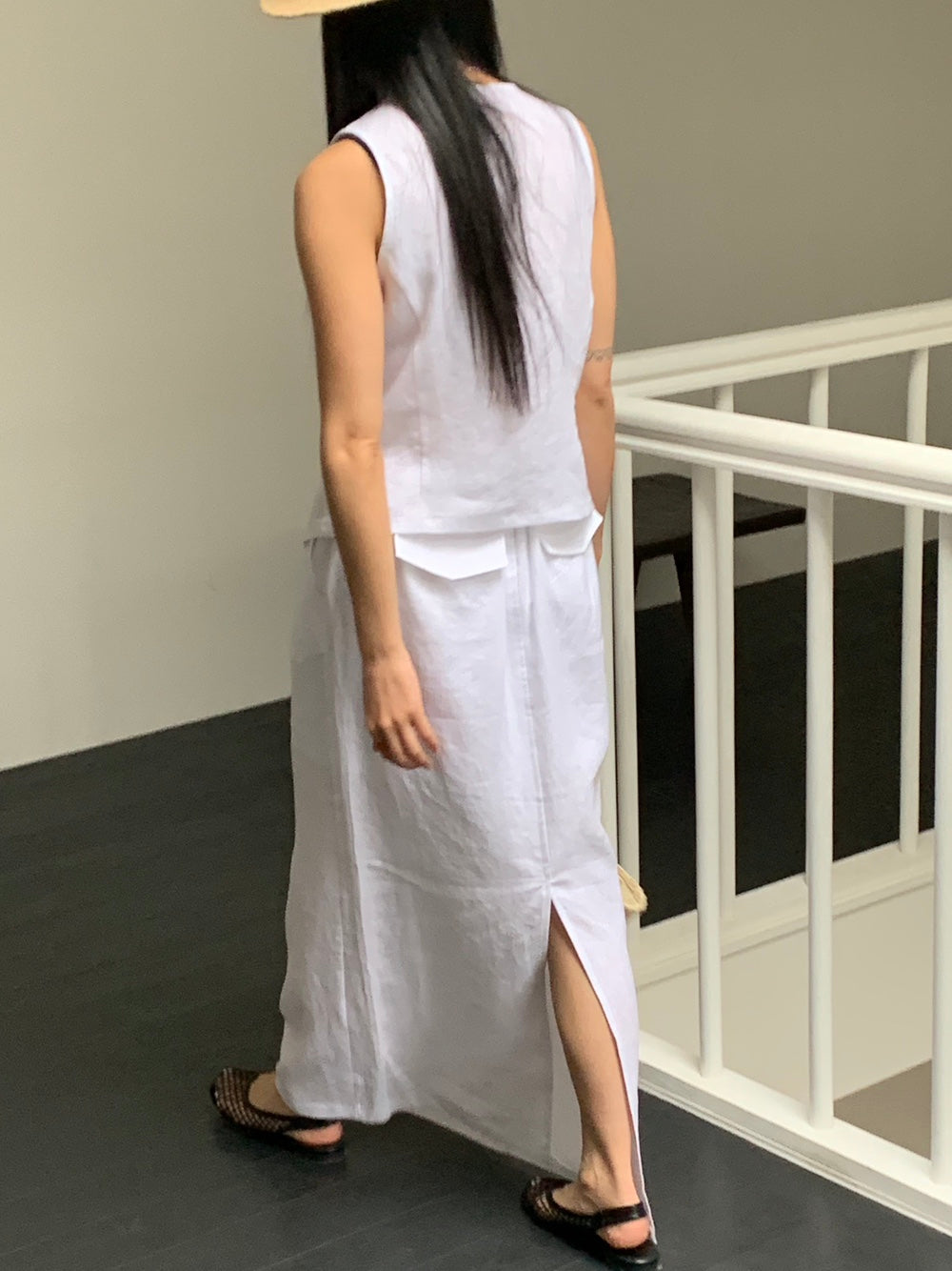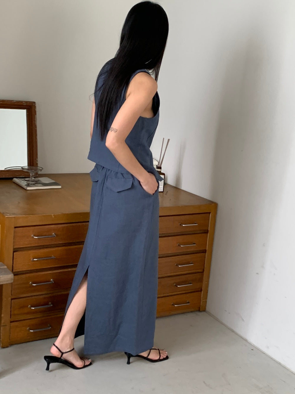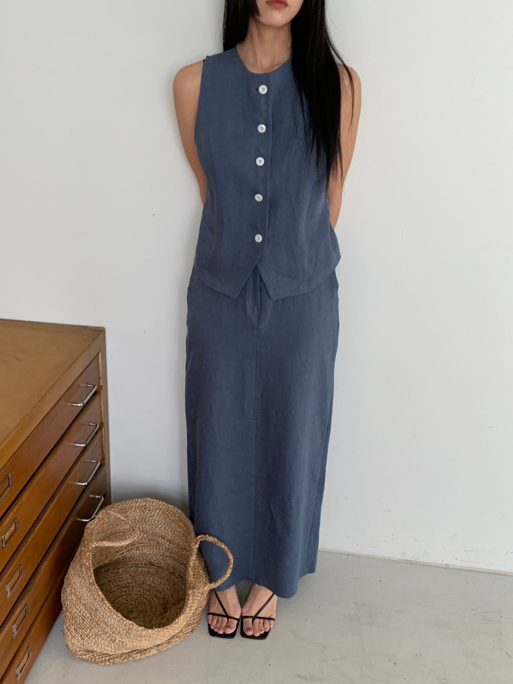 Crafted from premium linen dyed in small batches, this classic straight long skirt combines timeless style with exceptional comfort. Its tailored front waistband pairs elegantly with an elastic back, ensuring a flattering fit without compromising ease. Perfectly versatile, it can be styled with a matching vest for a polished look or dressed down with a simple T-shirt, making it an essential piece for effortless summer sophistication while the back slit shows off your sexiness. Available for pre-order to elevate your wardrobe with enduring quality and refined design.