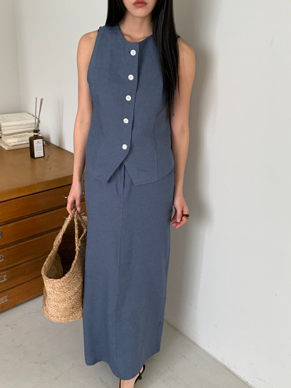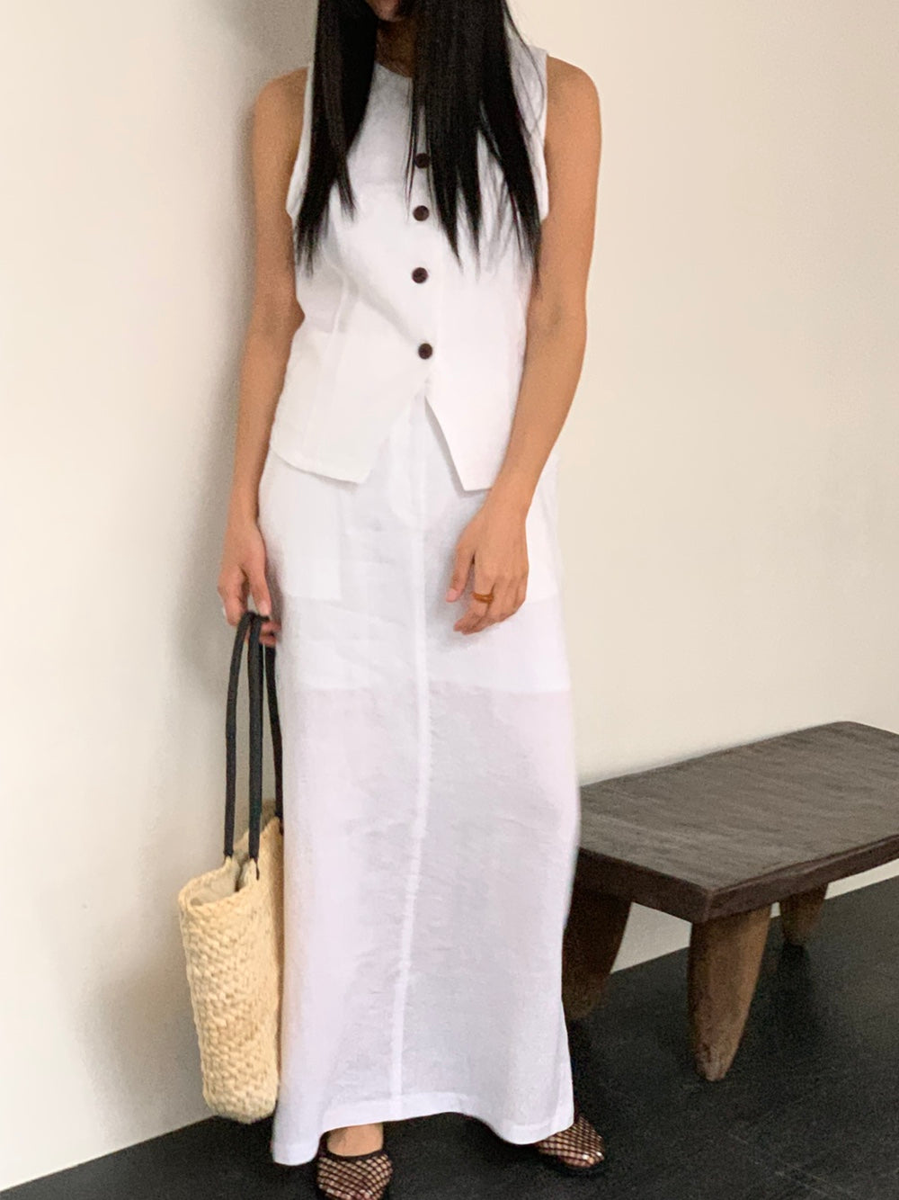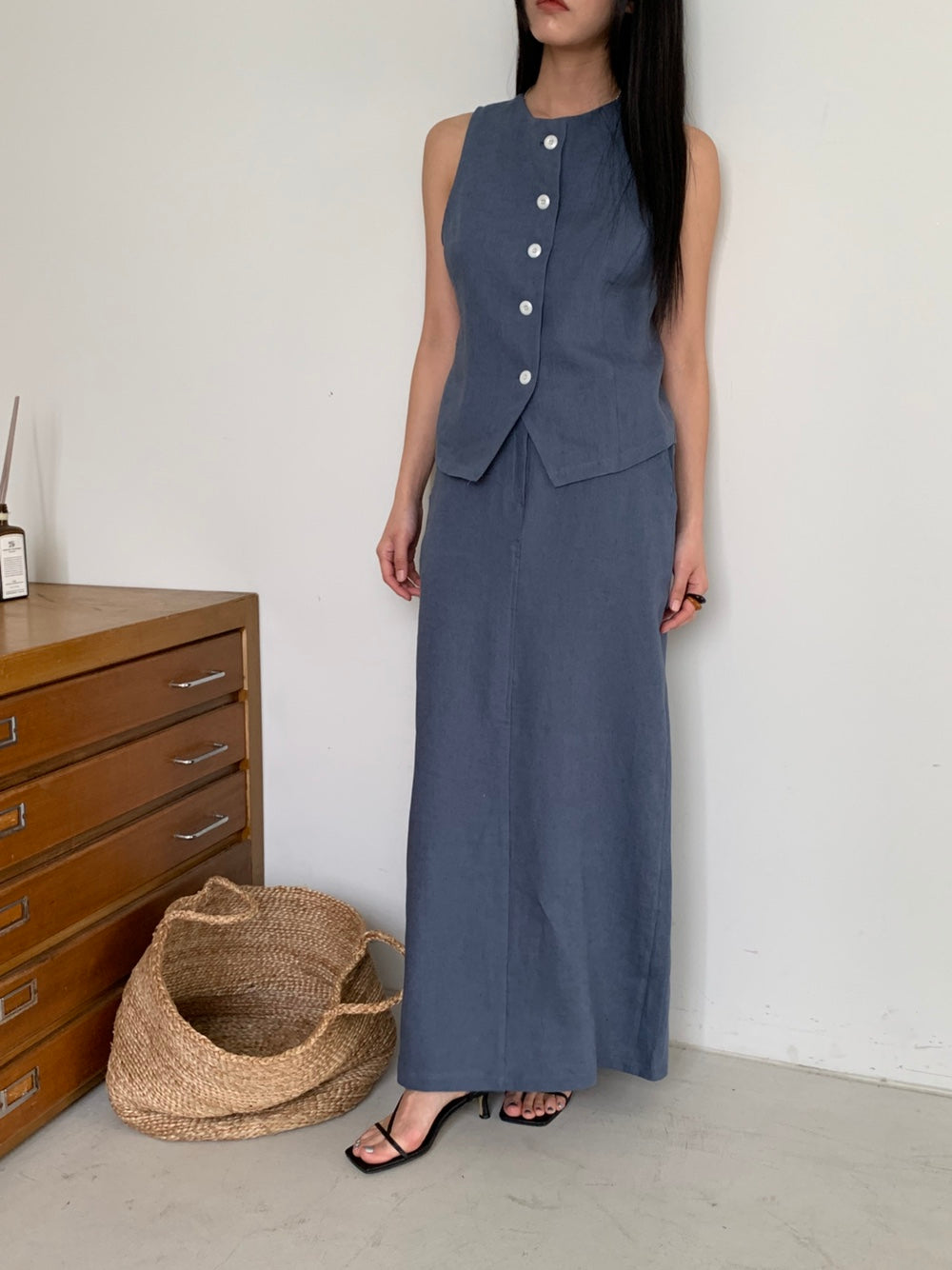 Crafted from premium linen dyed in small batches, this classic straight long skirt combines timeless style with exceptional comfort. Its tailored front waistband pairs elegantly with an elastic back, ensuring a flattering fit without compromising ease. Perfectly versatile, it can be styled with a matching vest for a polished look or dressed down with a simple T-shirt, making it an essential piece for effortless summer sophistication while the back slit shows off your sexiness. Available for pre-order to elevate your wardrobe with enduring quality and refined design.