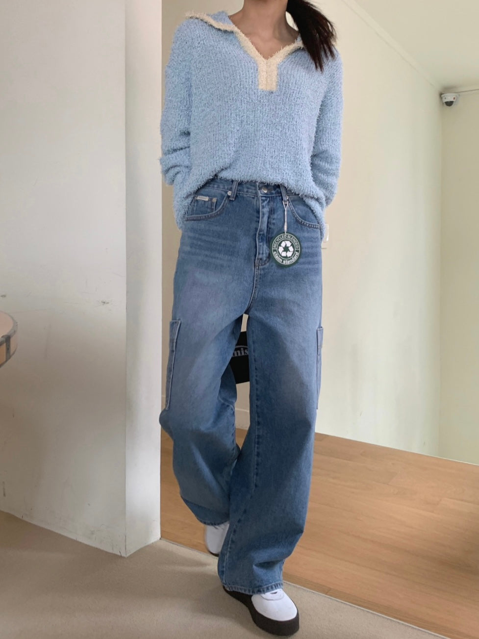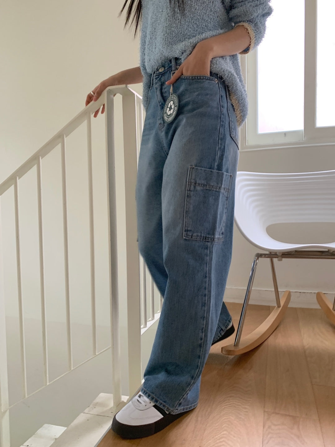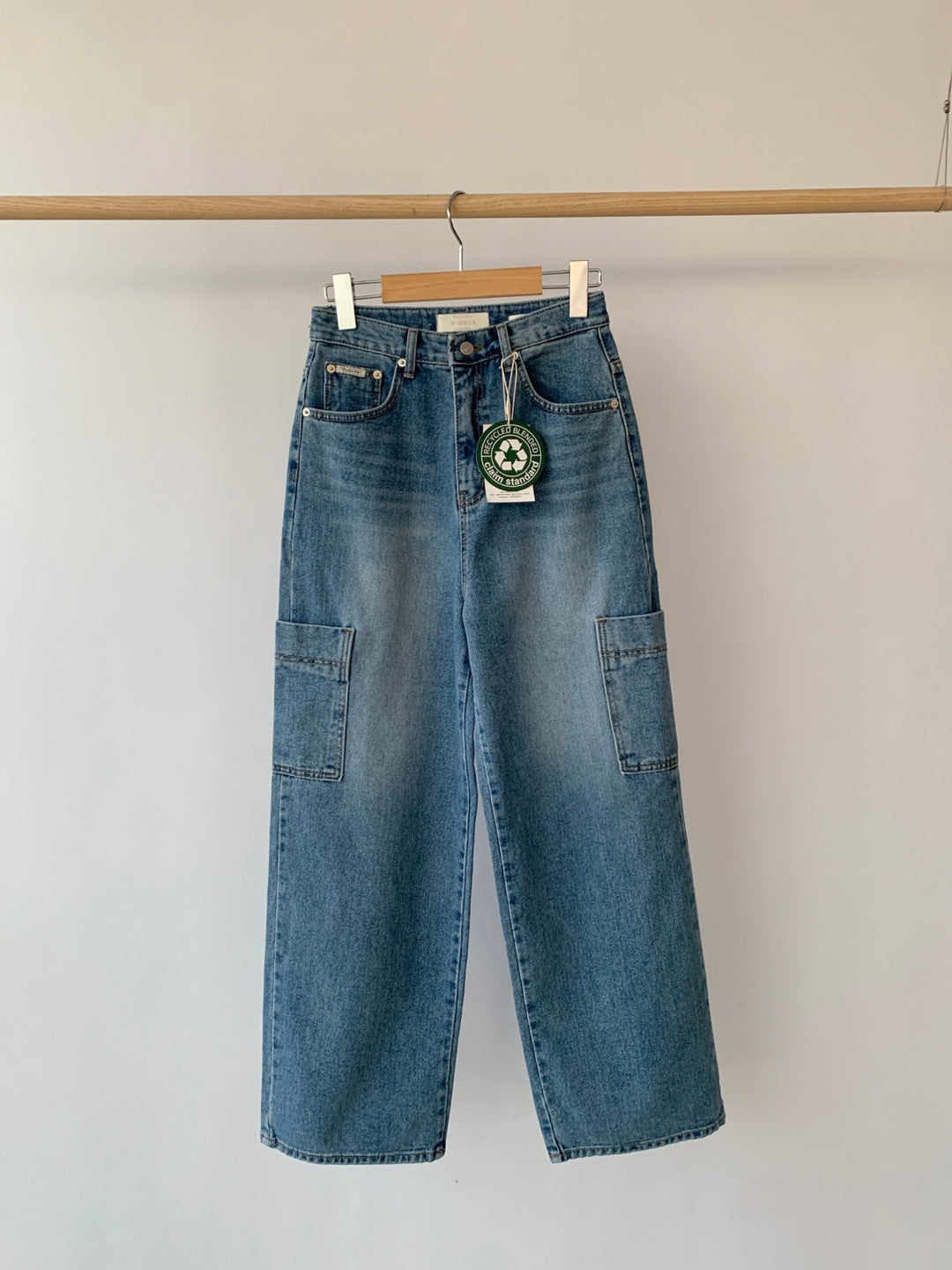 This recycled cargo style denim is designed for comfort and durability. Constructed with recycled cotton blend, it offers natural breathability and is tailored for a wide-leg fit. Functional cargo pockets provide extra storage and are reinforced to ensure lasting wear.