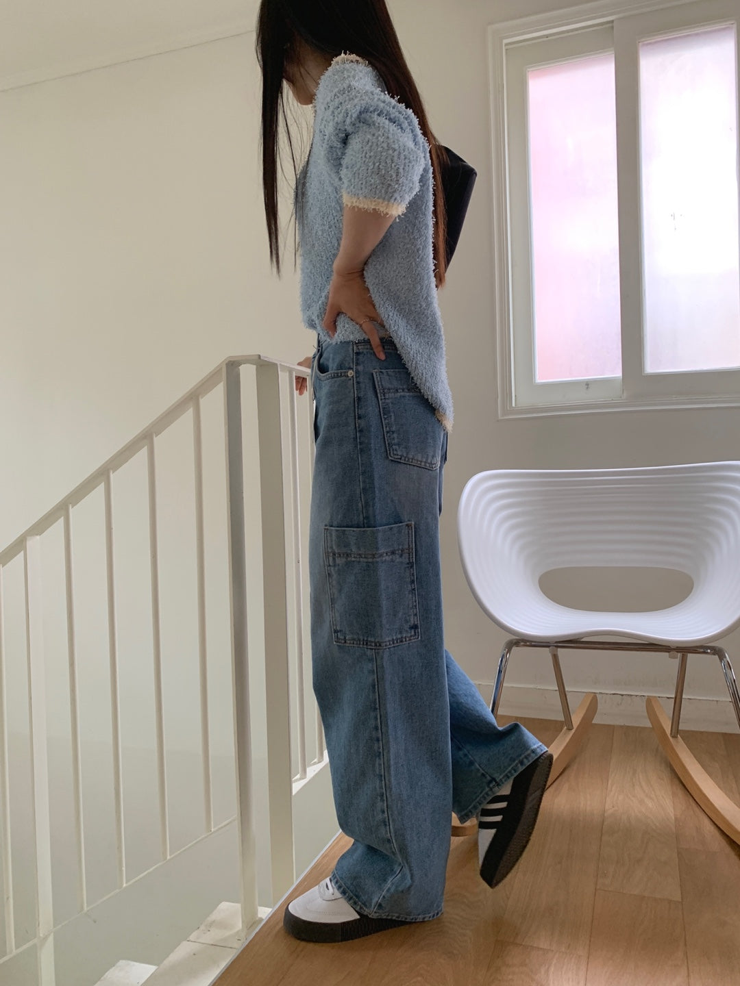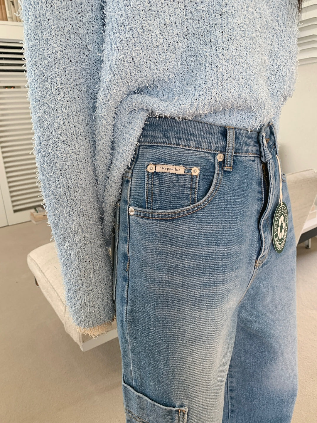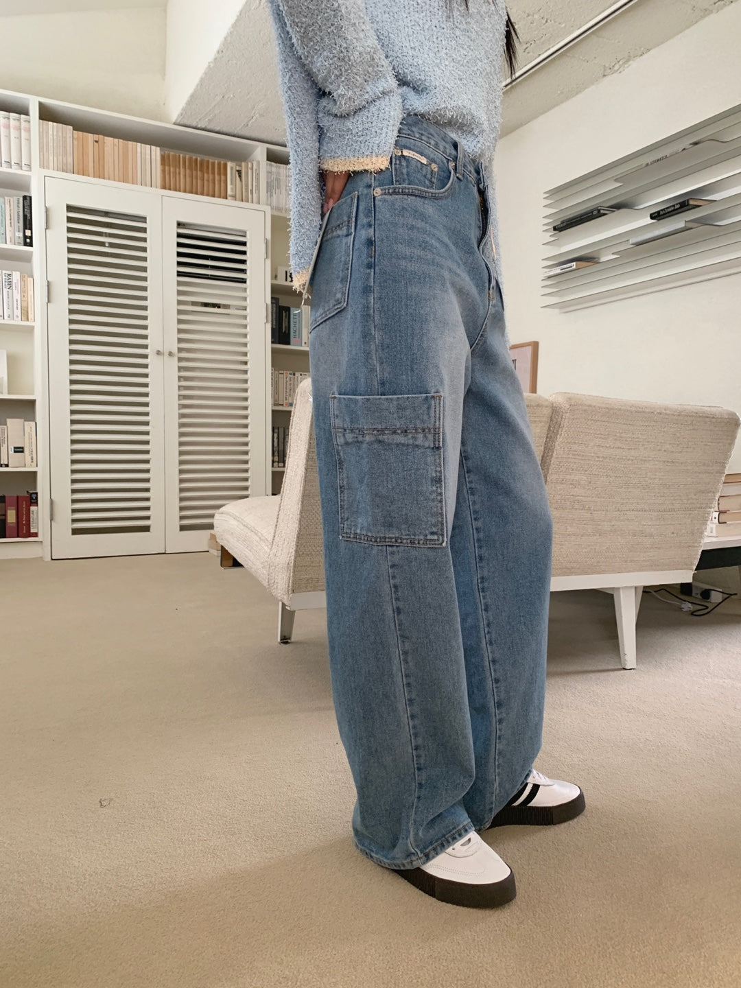 This recycled cargo style denim is designed for comfort and durability. Constructed with recycled cotton blend, it offers natural breathability and is tailored for a wide-leg fit. Functional cargo pockets provide extra storage and are reinforced to ensure lasting wear.