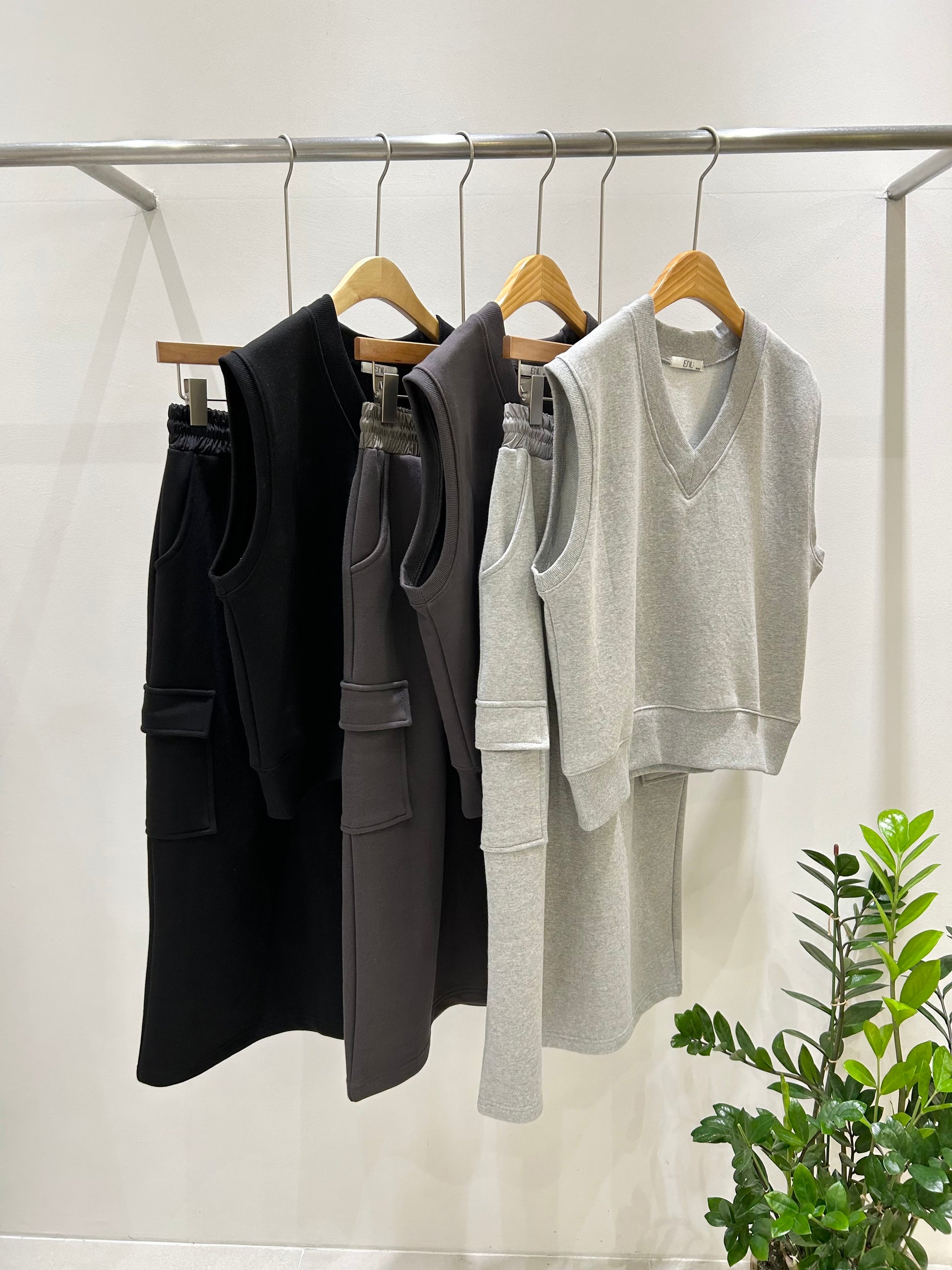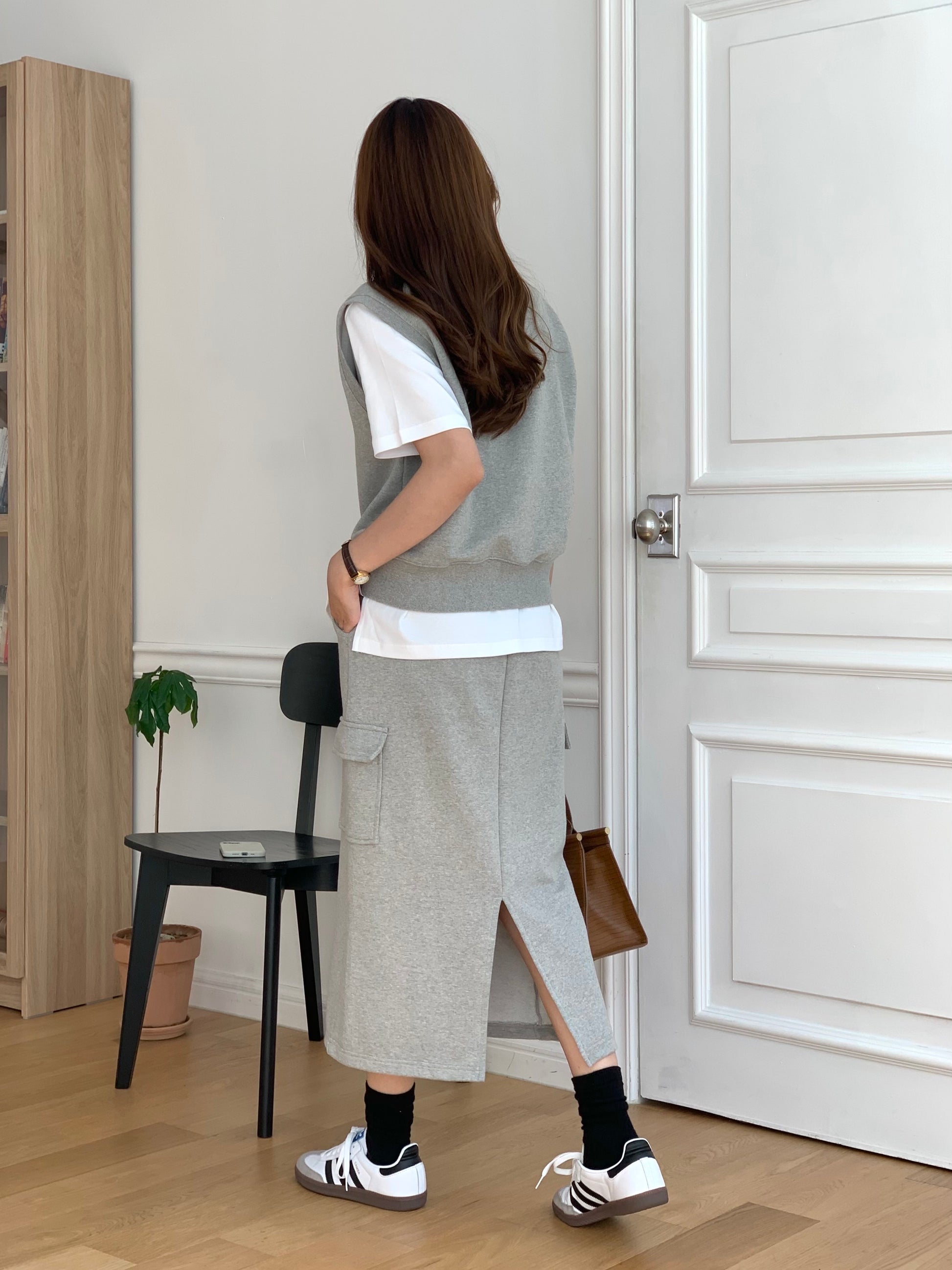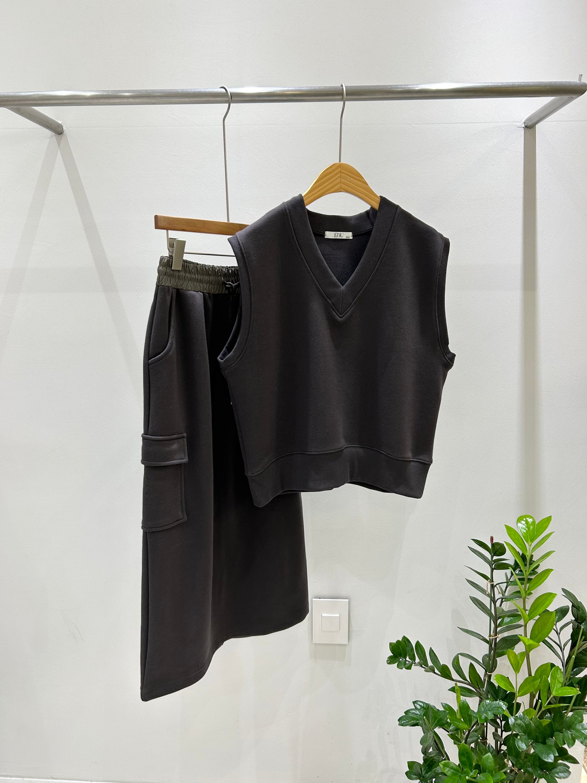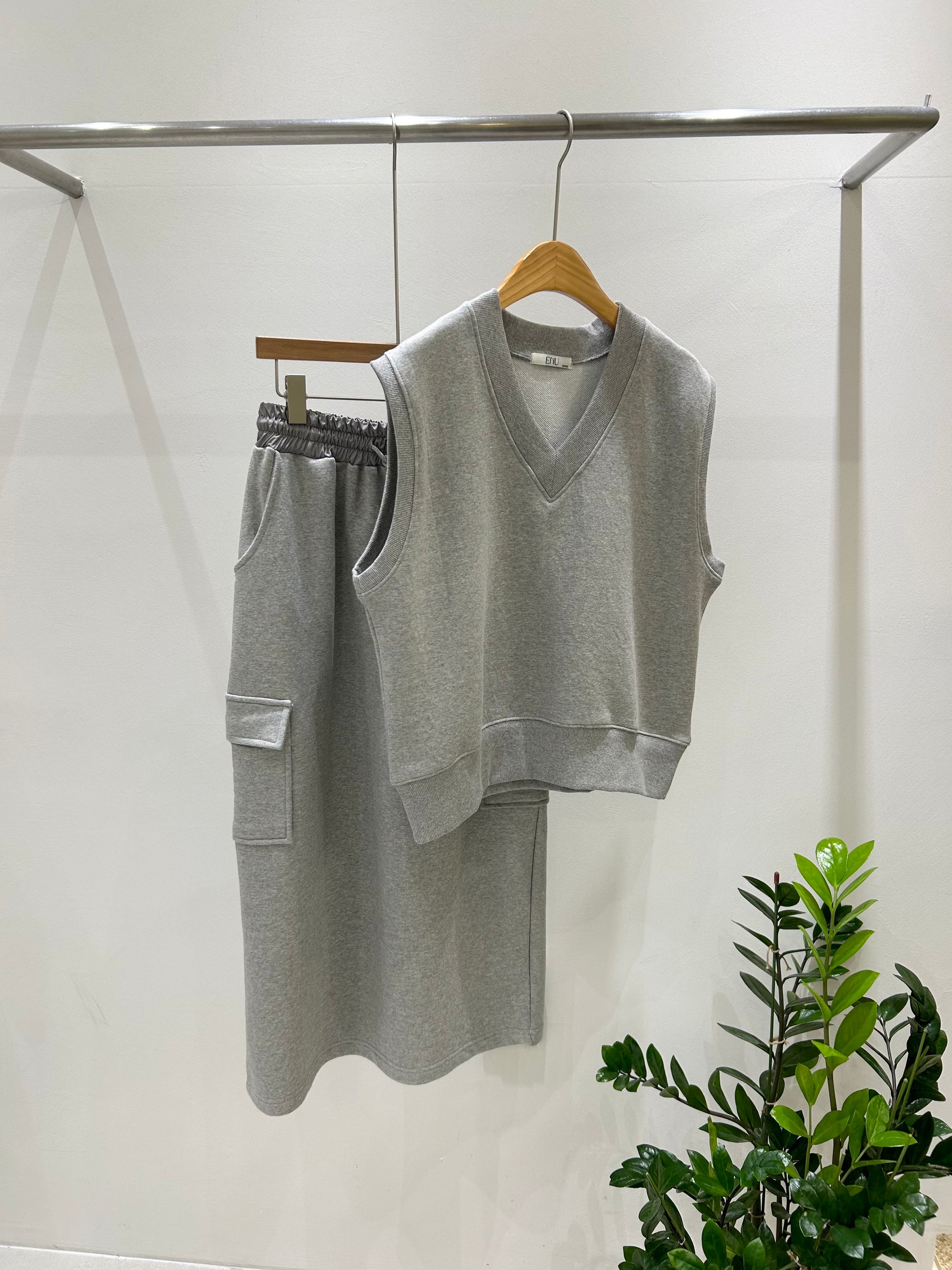 This 2pc Sweat Set is made to be versatile and flattering. The easy chic v neck vest features a wide armhole for easier styling, and the cargo skirt has a nylon contrast waistband with elastic for added comfort. Get the leisure chic look with this set.