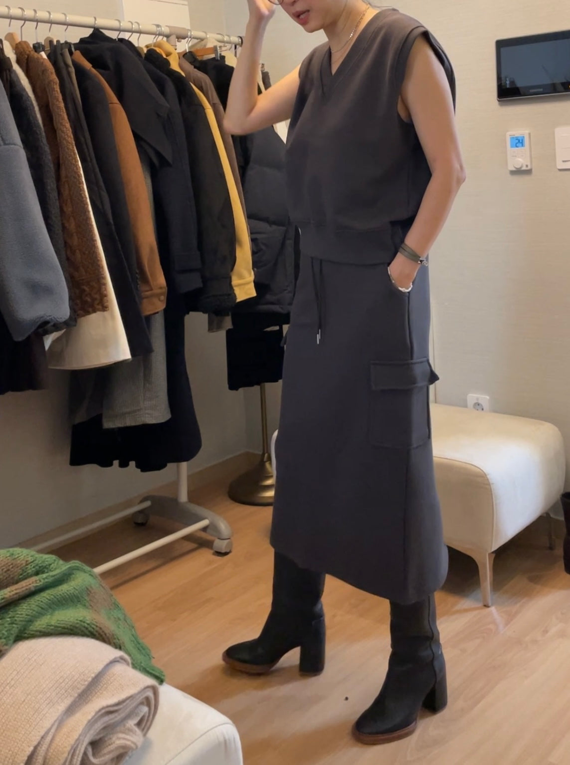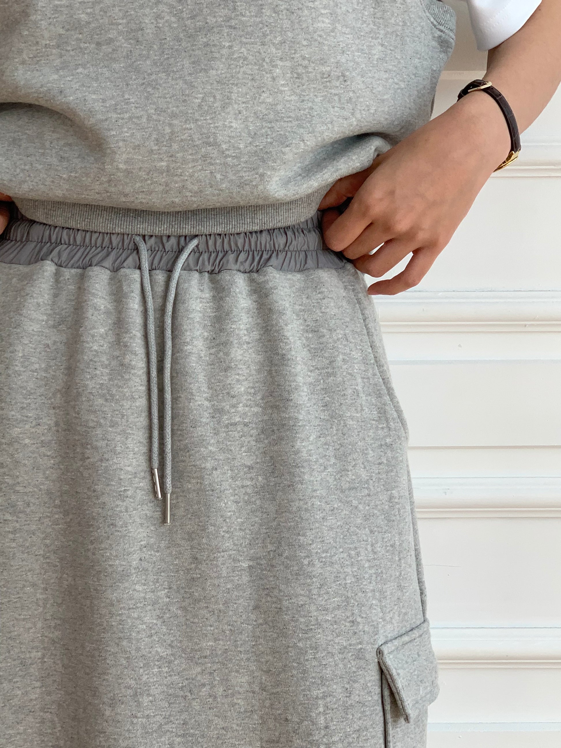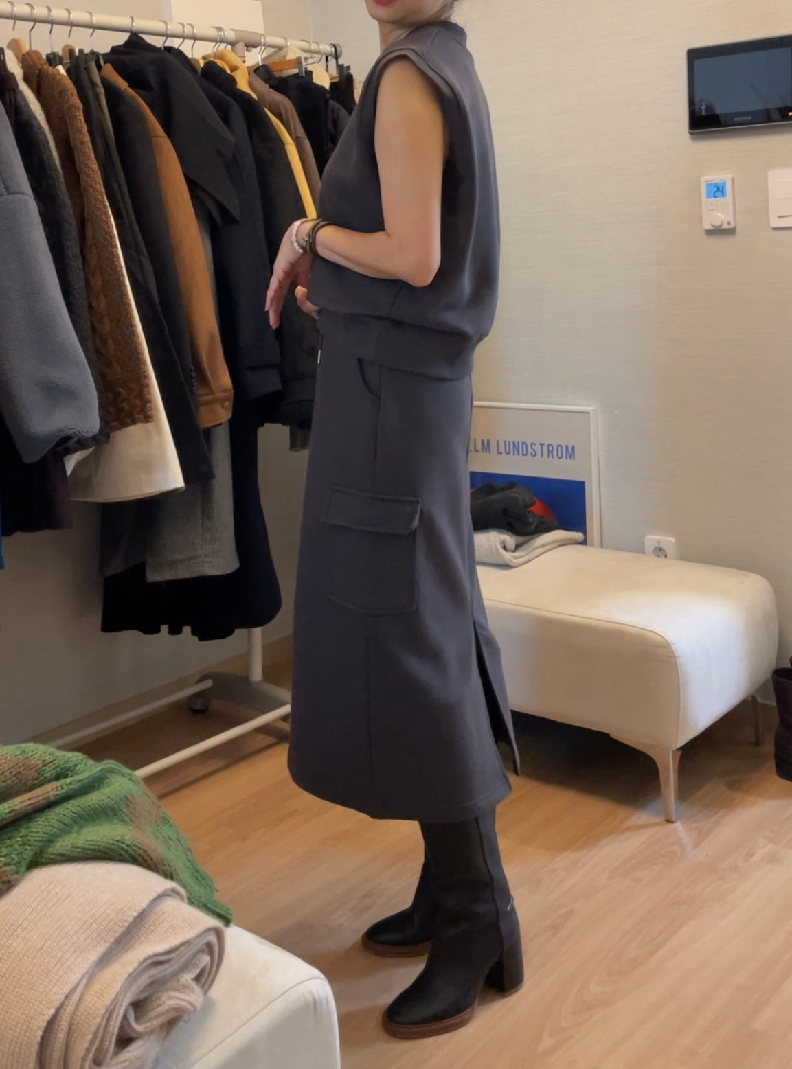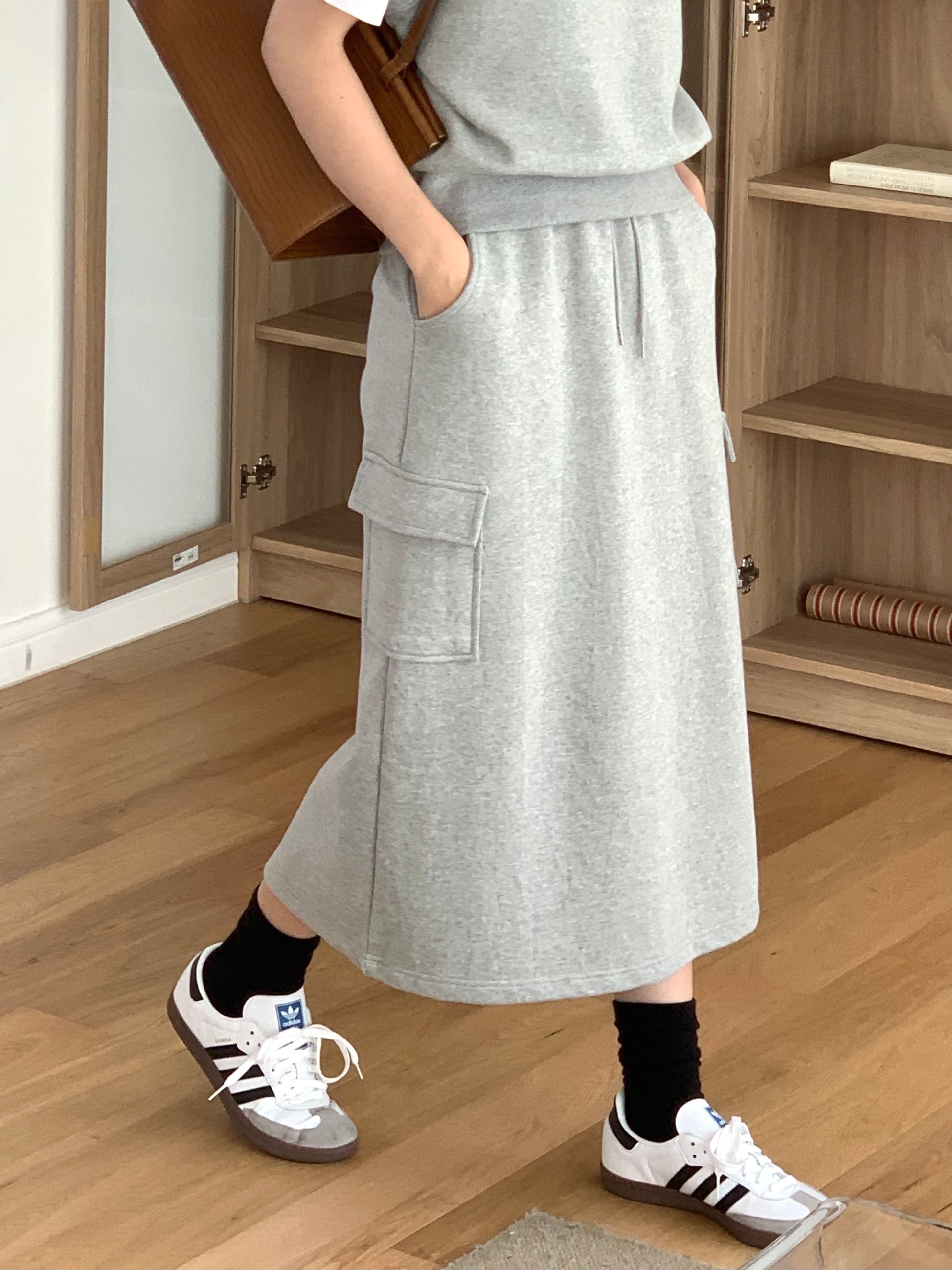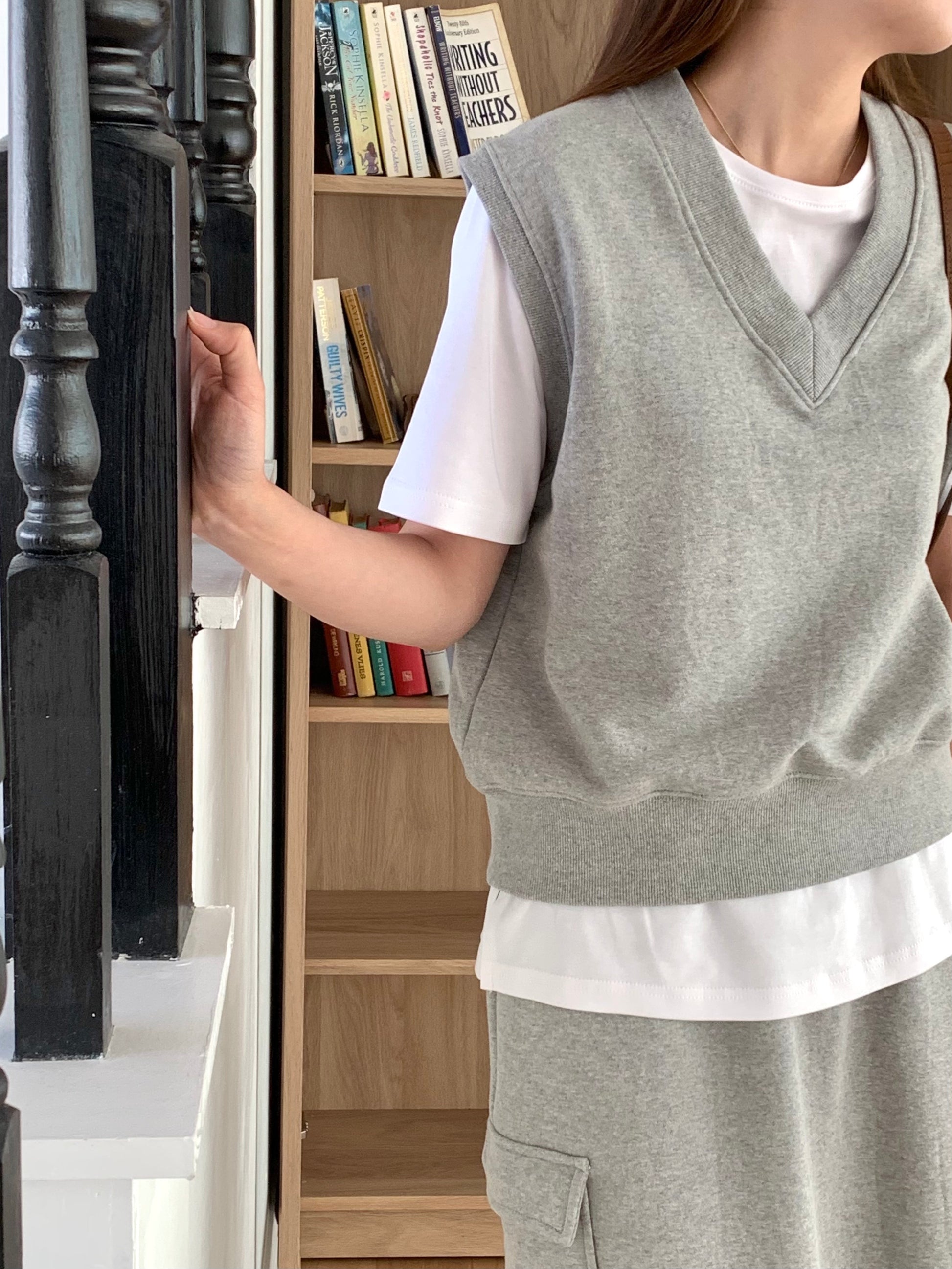 This 2pc Sweat Set is made to be versatile and flattering. The easy chic v neck vest features a wide armhole for easier styling, and the cargo skirt has a nylon contrast waistband with elastic for added comfort. Get the leisure chic look with this set.